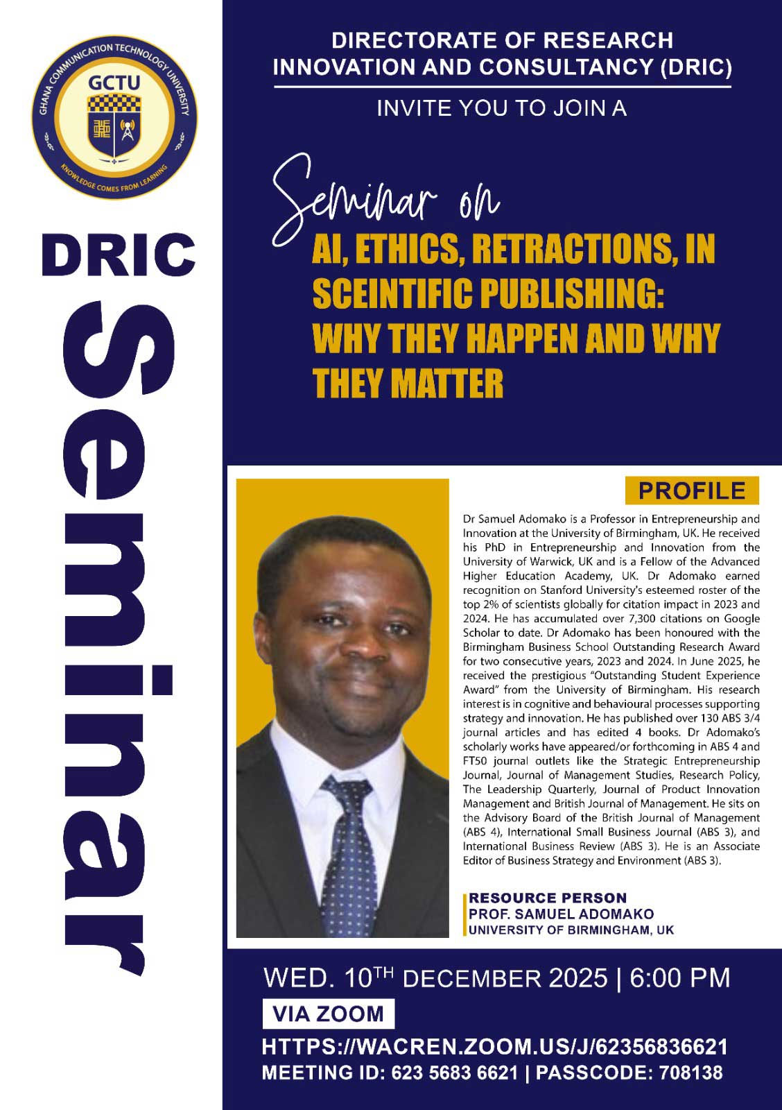 The Directorate of Research, Innovation and Consultancy (DRIC) is happy to invite the entire University Community to a virtual seminar on:
