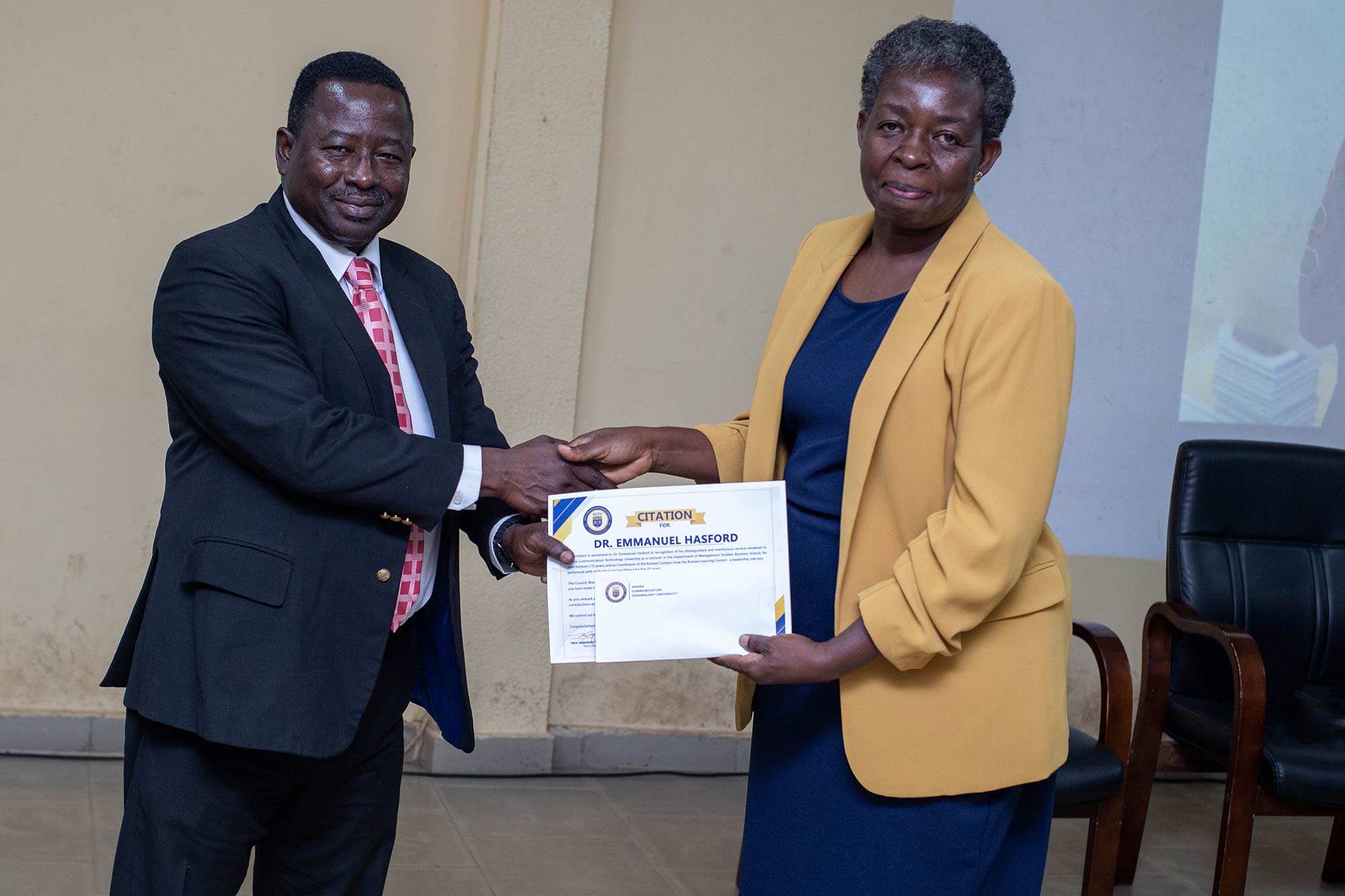 Prof. Theresa Obuobisa-Darko (right) receiving an award on behalf of Dr. Emmanuel Hasford, a retired staff.
